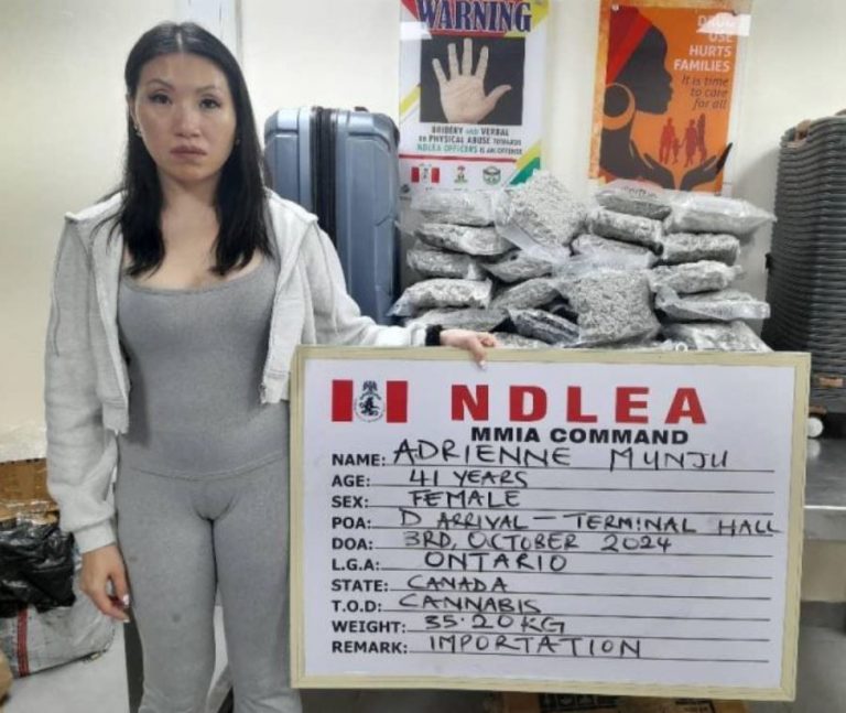 Adrienne Munju, a 41-year-old Canadian woman, has been sentenced to 11 years in prison by the Federal High Court in Lagos for importing 35.20 kilograms of cannabis, known as “Canadian Loud,” into Nigeria.